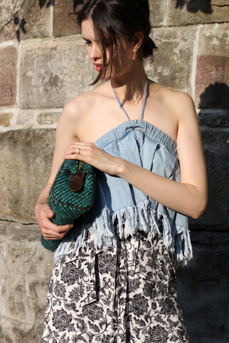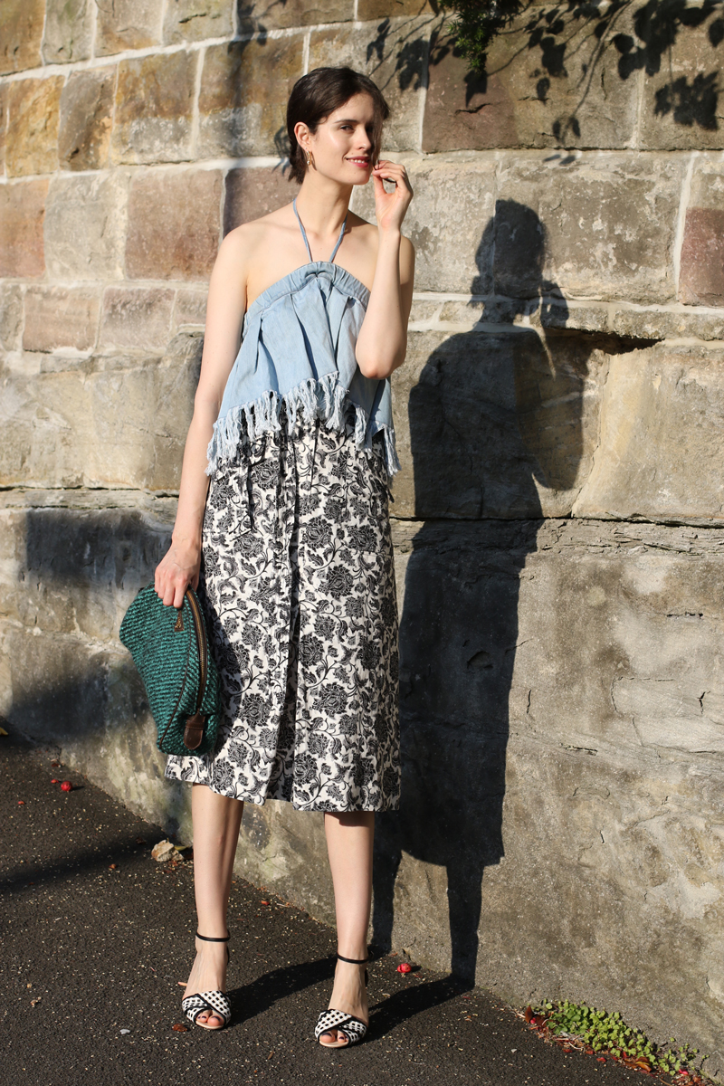 Top, Vale Denim. Skirt, Zimmermann. Earrings, Reliquia. Clutch, Prada. Shoes, Sportmax.