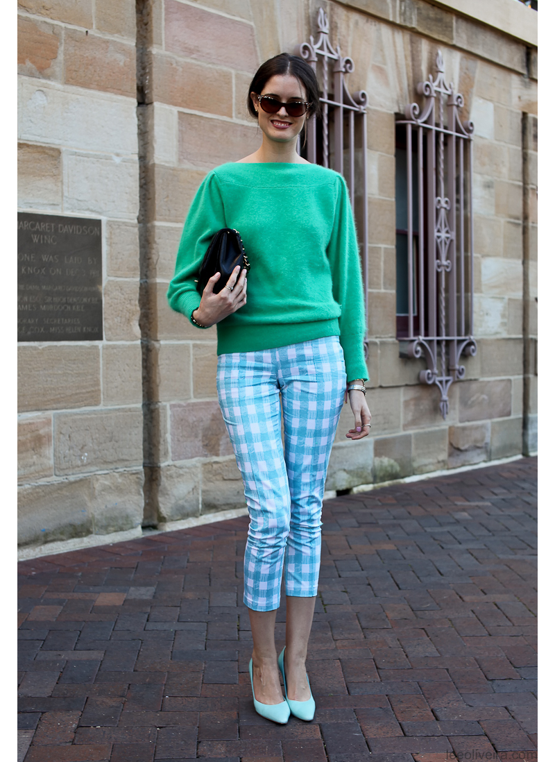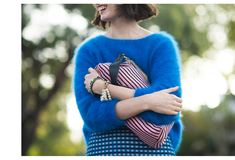 Shot by Adam Katz Sinding for Le21eme; wearing Gorman jumper, Bianca Spender skirt, Miu Miu bag, Mimco jewelled bracelet and J Crew pearl Bracelet.