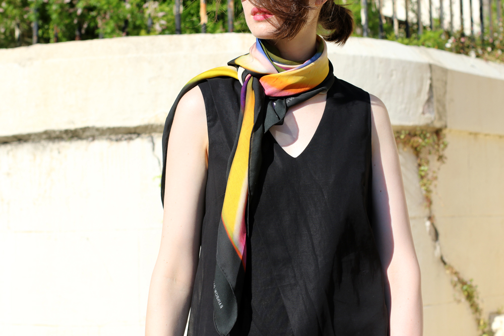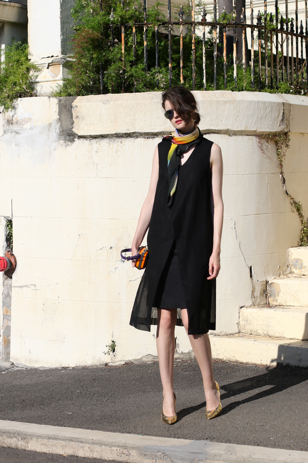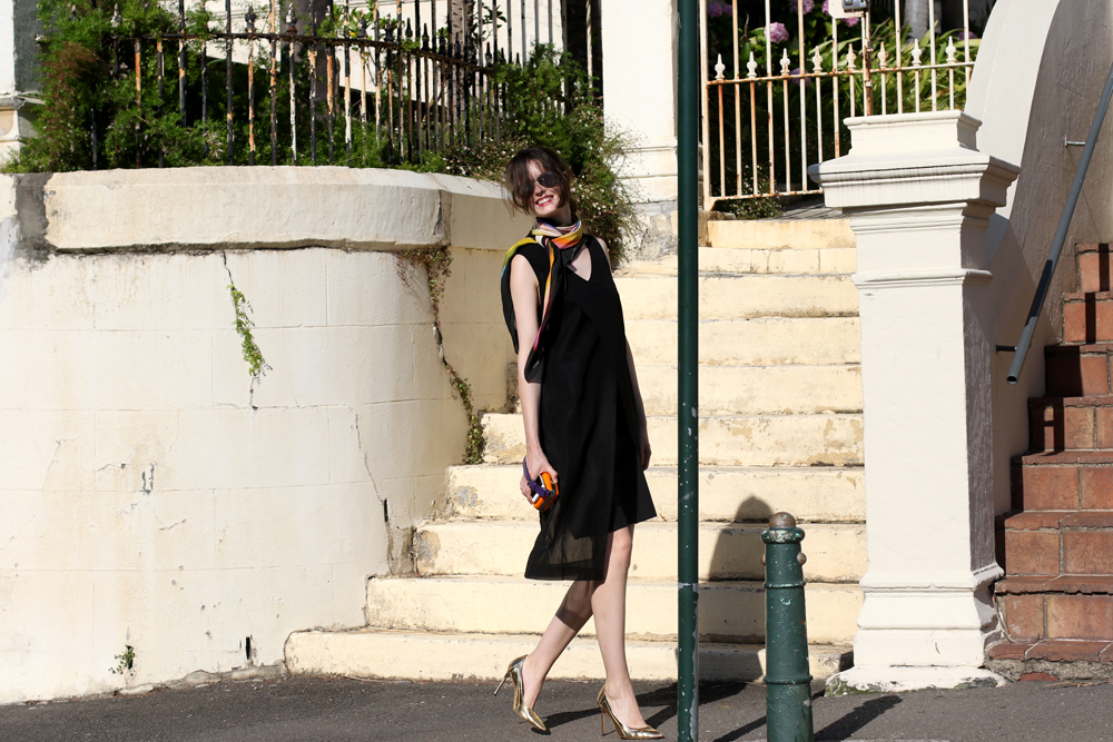 Dress, Gary Bigeni. Scarf, Deadly Ponies X Len Lye. Sunglasses, Rayban. Bag, Prada. Shoes, Manolo Blahnik.